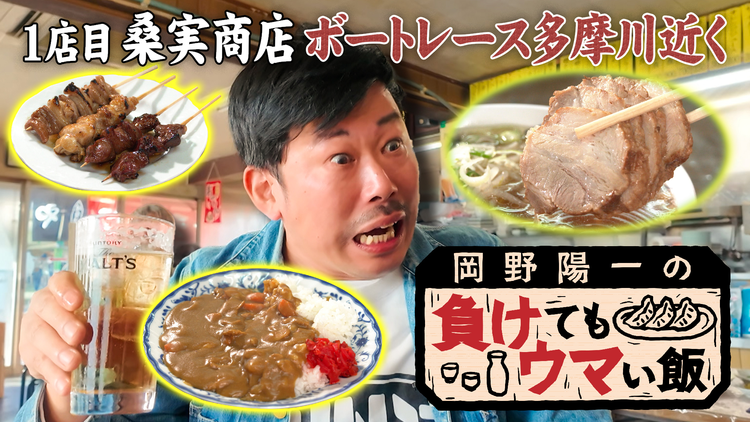 岡野陽一の負けてもウマい飯 負けを忘れるホッピーとカレーとチャーシュー麺/1店目 桑実商店(ボートレース多摩川近く)勝ってウマいのは当たり前。負けてもウマい飯を食べられる店こそが本当に良い店。今日も負けた岡野陽一がそんな負けウマグルメを探す番組。腹と心を満たすために今日訪れたのは、ボートレース多摩川のすぐ近くで 数々のギャンブラーを支えてきた「桑実商店」。ボートレース多摩川ができた71年前にオープンしたというこのお店は 負けた人にも優しい手頃な値段ながらも、本格的な味の料理を提供。敗者の岡野も、常連さんが負けた後に必ず頼むというメニューに舌鼓。府中市場から仕入れる、新鮮な1本120円の焼き鳥や、自家製チャーシューがたっぷり入ったチャーシューメン。岡野が食べた後に「俺今日負けてないわ!」と言い切る、負けウマグルメが続々。ギャンブルをやらない人もこれを食べるためだけに来て欲しいと岡野が語ったカレーとは?そして、常連の先輩ギャンブラーたちに「負けから学んだこと」を教えてもらう。ギャンブル歴数十年の方々の、考え方に岡野も驚愕。