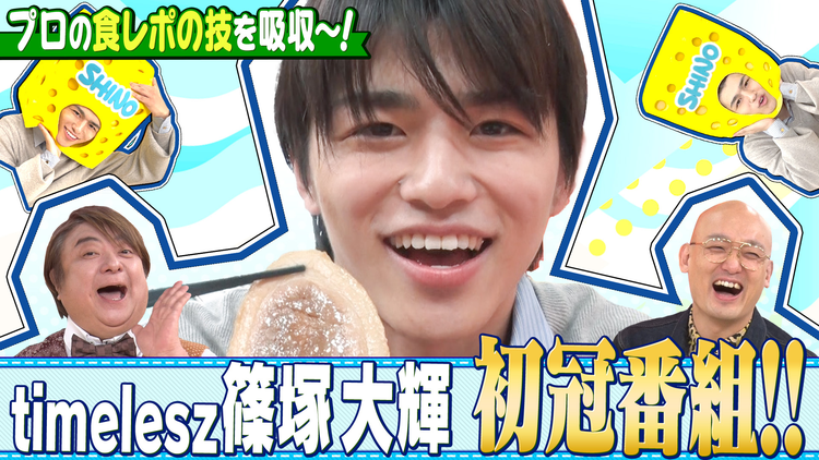 スポンジ・シノ “カットされない食リポ講座”/timelesz 篠塚大輝の初冠番組「スポンジ・シノ」★アイドルとしてさらに飛躍を遂げるため、その道のプロである講師から、知られざるエンタメの“ルール”そして“熟練の技術”をtimelesz 篠塚大輝が学び、吸収する!★初回の授業は食リポのプロ・彦摩呂による「カットされない食リポ講座」