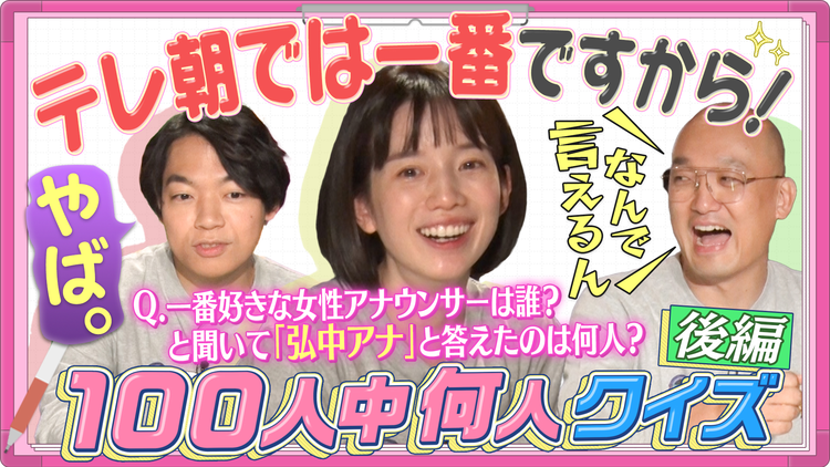 新企画「100人中何人クイズ」・後編/今回は「100人中何人クイズ」後半戦 街頭で100人にインタビューし、その内容からクイズを出題!「好きな女性アナウンサーは誰ですか?と聞いて、弘中アナと答えたのは100人中何人?」 まさかの結果に弘中アナ驚愕…世間の感覚を一番持っているのは誰!?