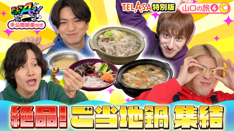 EPISODE69 山口の旅(4)/未公開映像を加えたTELASA特別版!山口県のご当地鍋を食べ尽くすゲーム対決、後編!あんこう鍋をかけて対決したのは、栃木県でも行った甘い階段ゲーム。あらかじめ決められたシチュエーションでキュンキュンセリフを順番に繋げていくのだが、小島の小難しいセリフに、佐野が大慌てしてしまう!?