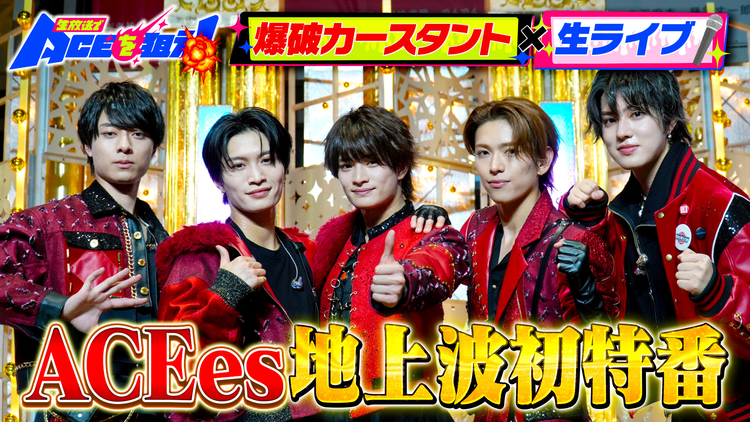 ACEes初の地上波特番!大爆発カースタント&コスプレ全力疾走/ACEes初の地上波特別番組!生放送で5人が全力投球のエンターテイメントをお届け!!▼アイドルたるもの、どんな状況でも上手に歌えなければならない!ということで「カースタント歌謡祭」に挑戦!!▼カースタントの車内でカラオケ85点以上を目指す!▼しかも課題曲は偉大な先輩の名曲!▼絶対に失敗できない状況だが…壁にツッコんだり、大爆破があったりと過酷なトラップの数々が!▼あまりの過激なカーアクションに度肝を抜かす5人!▼アイドルたるもの、写真は常にナイススマイルでなければならない!ということで「コスプレ水上ゴザ走り」に挑戦!!▼水上に敷かれたゴザの上を全力疾走し、最終的にアイドルスマイルで写真を撮られれば成功!!▼しかし、JKやチャイナドレスなどのマニアックなコスプレと、初体験のゴザ走りに悪戦苦闘!▼さらに、先輩たちの名曲をメドレーで披露するスペシャルステージも!!