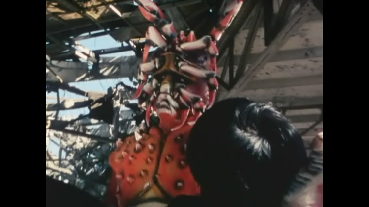 第8話 「ムカデンジンの罠 謎の手術室」/ネオショッカーの改造手術が失敗し、抹殺される直前に脱走した青年、進藤誠は、某銀行の頭取にネオショッカーが襲撃を企てていることを告げる。そして予告通りその夜、頭取はムカデジンに襲われるが、誠と洋によって救われた。