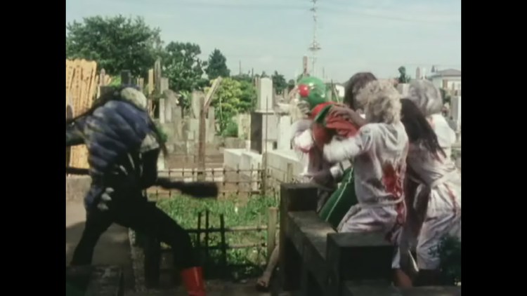 第42話 「怪談シリーズ・ゾンビー!お化けが生きかえる」/死人博士がゾンビとして蘇らせた死体が各地を徘徊していた。ゾンビは、攻撃を受けてその体をバラバラにされても、すぐ再生できる能力を有しており、この不死身の戦闘員をもって仮面ライダーを襲撃しようというのである。倒しても倒しても襲い来るゾンビ軍団になす術もないライダーは…。