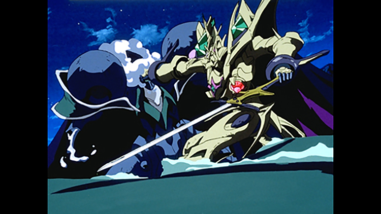 第2話 幻の月の少女/光の柱に包まれたひとみが気づいたのは、空に月と地球が浮かび、豊かな自然の中で人間と獣人が共存し、そして竜が跋扈する不思議な世界ガイアだった。バァンの戴冠式に招かれたひとみだったが、そこに姿を消した巨大な敵の侵攻が始まり、バァンはエスカフローネに搭乗する!【提供:バンダイチャンネル】